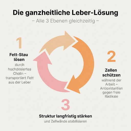 Was wohl den Unterschied beim Präparatmacht? Cholin. Dieser eine Nährstoff, der in fast keinem anderen Leber-Produkt in relevanter Dosis enthalten ist. Und das 3-Ebenen-System, das nicht nur Symptome lindert, sondern das Kernproblem angeht: den Fett-Stau in der Leber.