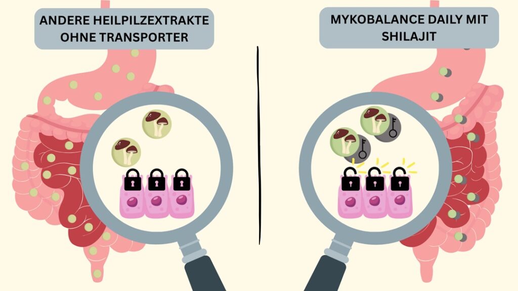 Das Shilajit mit seinen wertvollen Fulvin- und Huminsäuren dient dabei als natürlicher Transporter, der die Wirkstoffe der Pilze gezielt in die Darmwand einschleust. Zusätzlich unterstützt es die Ausleitung von Schadstoffen und versorgt das Darmgewebe mit essenziellen Mineralien.