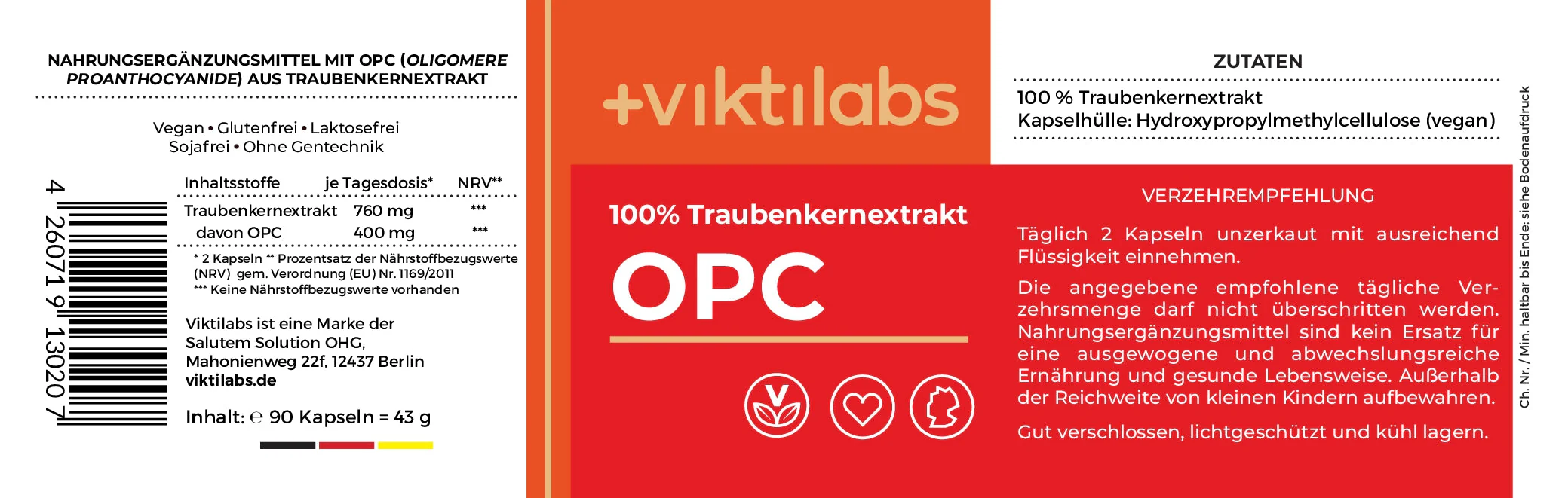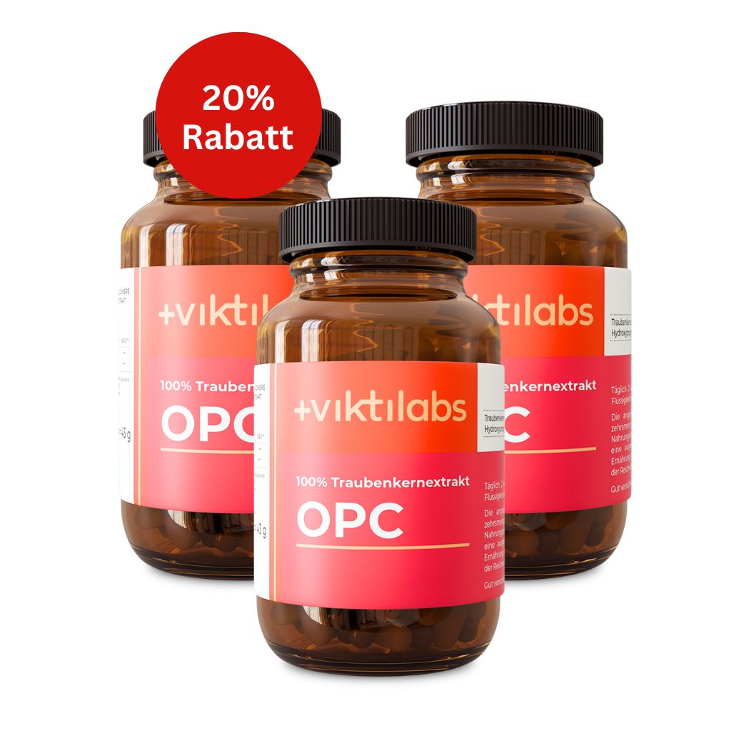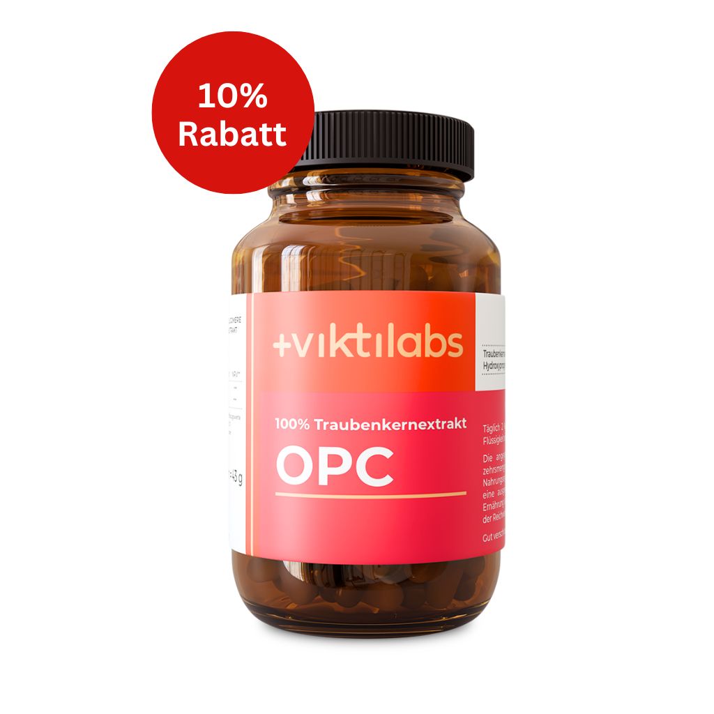 Oligomere Proanthocyanidine, kurz OPC, sind sekundäre Pflanzenstoffe, die als natürliche Antioxidantien wirken. Sie schaffen ein pflanzliches Abwehrsystem, das die Pflanze vor UV-Strahlung, Klimaeinflüssen und Schädlingen schützt. OPC wird häufig aus Traubenkernen gewonnen und unterstützt den Körper dabei, freie Radikale zu neutralisieren. Unser hochdosierter OPC-Extrakt ist zudem gut bioverfügbar. Sollten unerwünschte Reaktionen auftreten, empfehlen wir, die Einnahme zu beenden und einen Arzt oder eine Ärztin zu konsultieren.