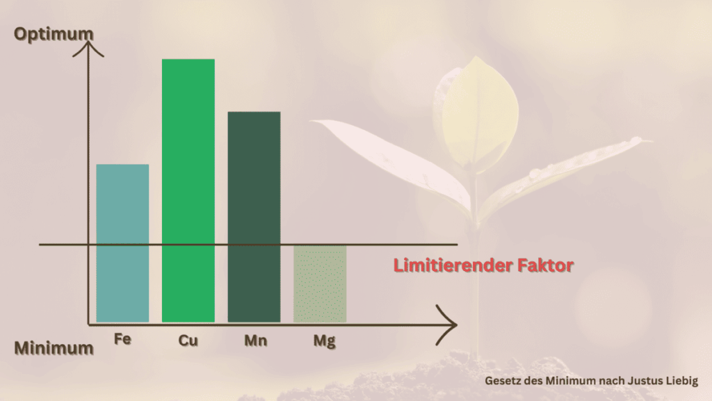 Das Gesetz des Minimums, ursprünglich vom Chemiker Justus von Liebig formuliert, besagt, dass das Wachstum eines Organismus immer von dem Nährstoff begrenzt wird, der in der geringsten Menge vorhanden ist – unabhängig davon, wie viel von anderen Nährstoffen vorhanden ist.