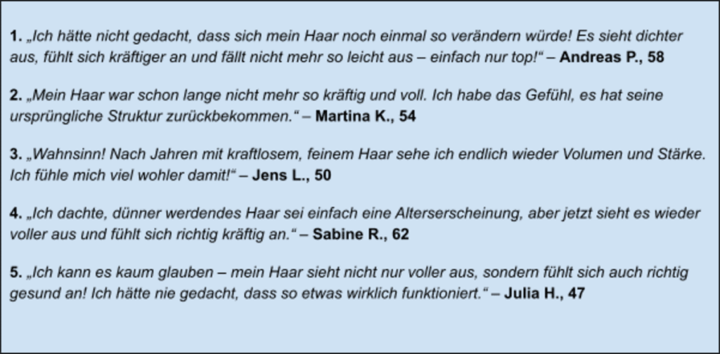Auch Sabine testete das Produkt vier Monate lang – und war hellauf begeistert. Schon nach wenigen Wochen bemerkte sie erste Veränderungen: Ihr Haar fühlte sich kräftiger an, ließ sich leichter kämmen und wirkte insgesamt griffiger.