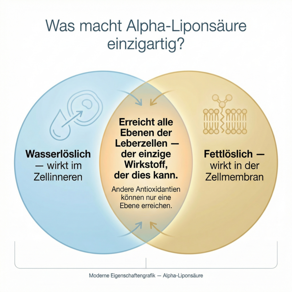 90 mg Alpha-Liponsäure ist wasser- und fettlöslich zugleich — eine biochemische Eigenschaft, die es ihr erlaubt, Leberzellen auf allen Ebenen zu erreichen, wo andere Antioxidantien nicht hinkommen.