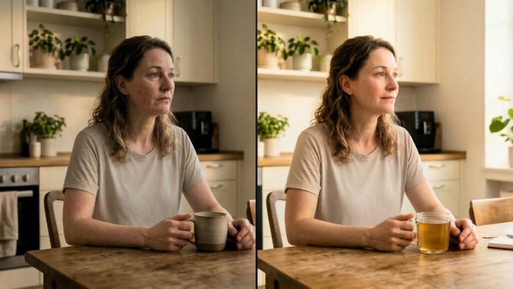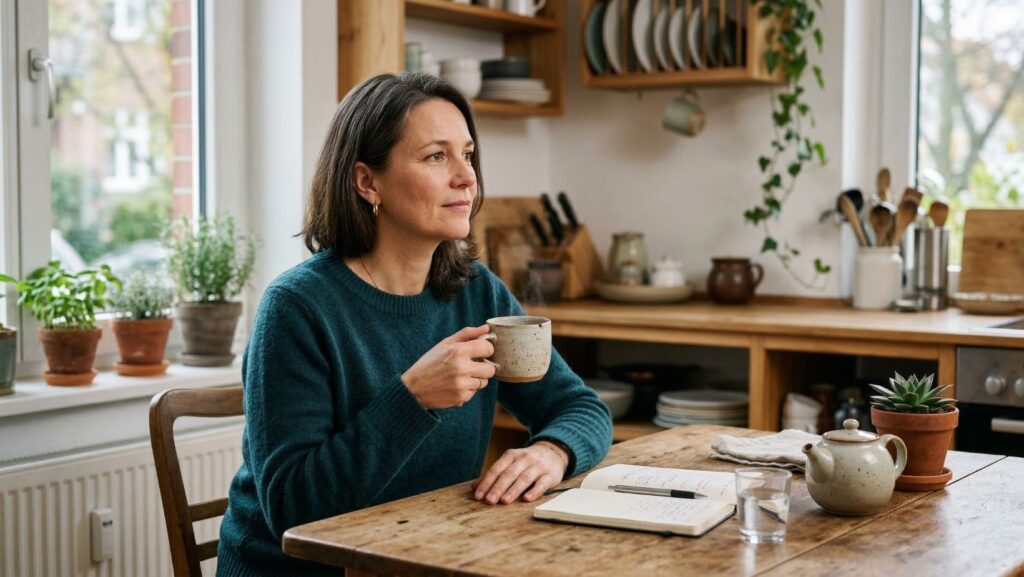 Nach etwa drei Wochen merkte ich, dass ich insgesamt ruhiger wurde. Nicht nur die Haut – auch mein Körpergefühl. Weniger dieses diffuse innere Unwohlsein. Nach fünf Wochen fiel meinem Mann auf, dass meine Haut an den typischen Stellen – Ellenbogen, Kniekehlen – weniger gerötet war. Nicht weg. Aber deutlich ruhiger.