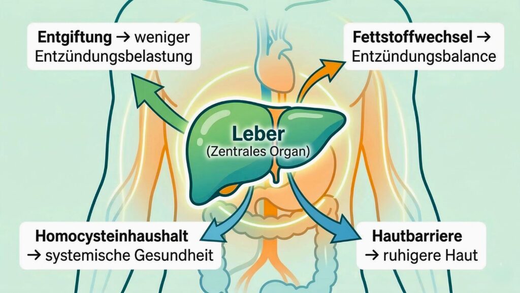 Wenn die Leber dauerhaft unter Druck steht, helfen keine äußerlichen Maßnahmen, die Entzündungsbereitschaft langfristig zu senken. Wenn der Fettstoffwechsel gestört ist, bleibt die innere Entzündungsquelle aktiv. Wenn Entgiftungsprozesse nicht reibungslos laufen, trägt die Haut die Last. Das ist keine Frage der Disziplin. Das ist Biochemie.