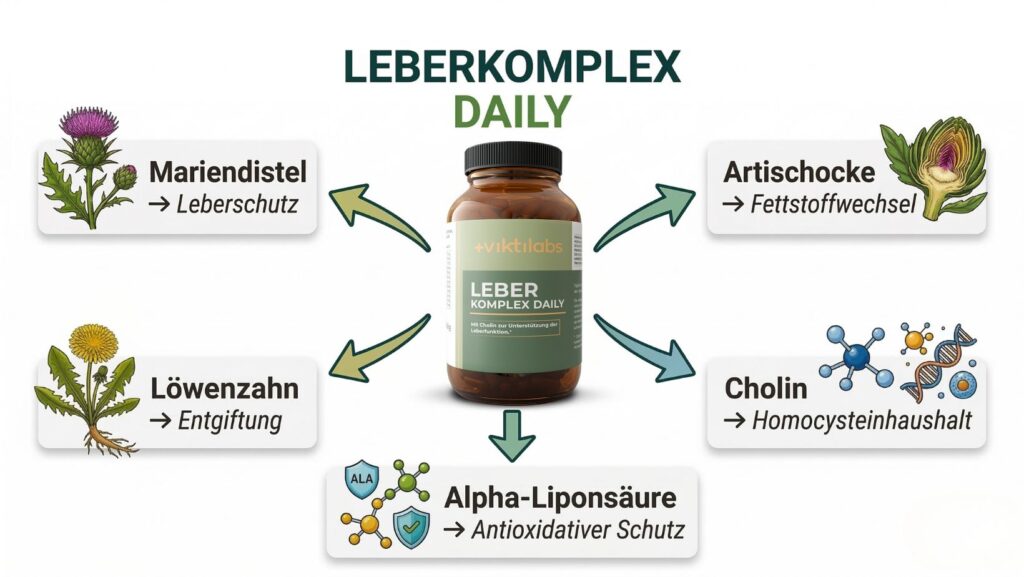Dazu kommen moderne Mikronährstoffe wie Cholin – unverzichtbar für den Fett- und Homocysteinhaushalt – sowie Alpha-Liponsäure, einer der wirkungsvollsten antioxidativen Wirkstoffe, den die Forschung kennt.
