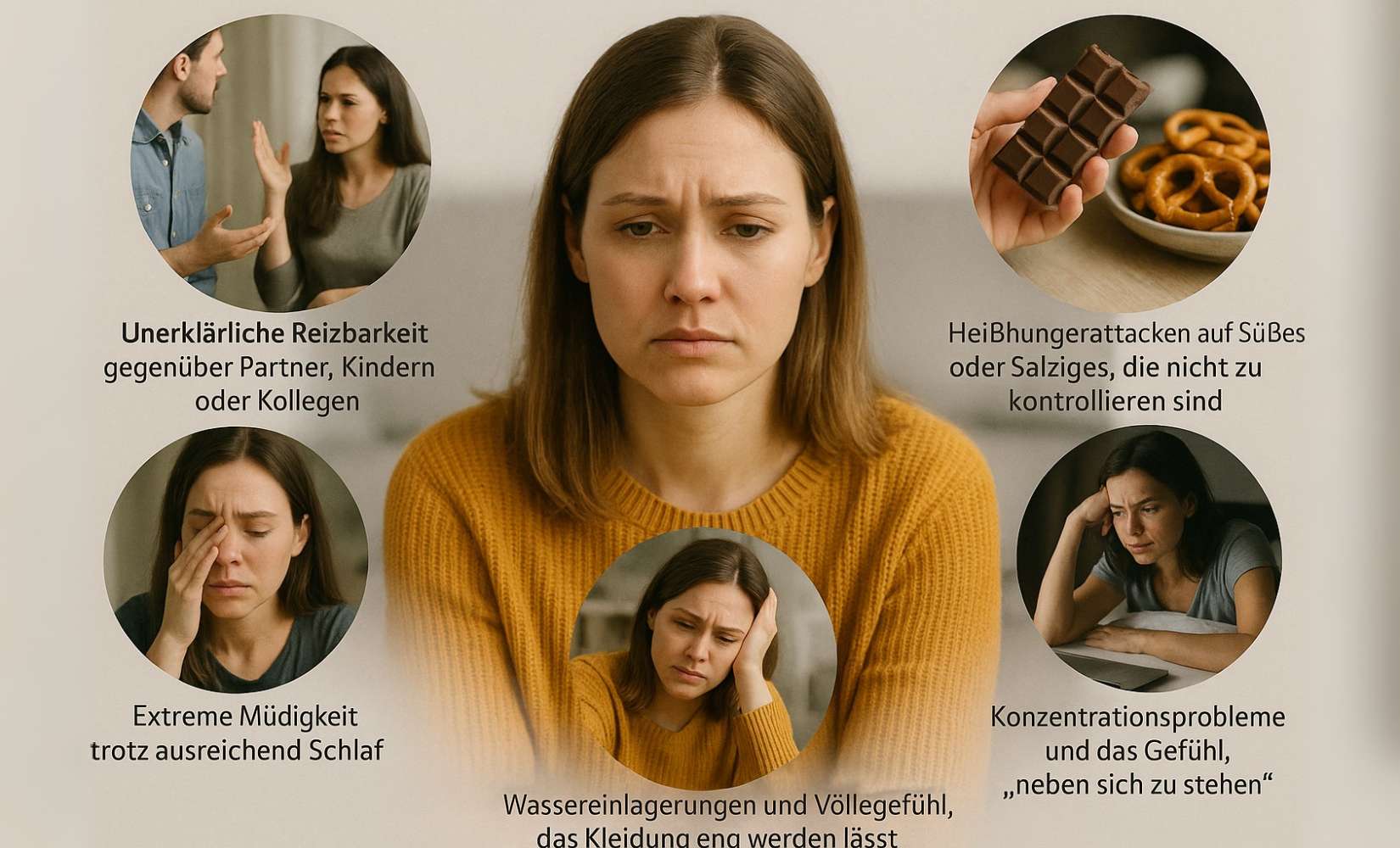 - Wassereinlagerungen und Völlegefühl, das Kleidung eng werden lässt