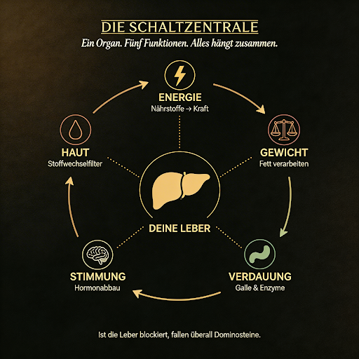Denn die Leber ist nicht einfach nur „das Entgiftungsorgan“, als das sie in Detox-Ratgebern verkauft wird. Sie ist die Schaltzentrale deines gesamten Stoffwechsels.
