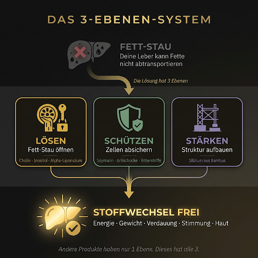 Doch noch entscheidender: Die Leber braucht nicht nur Cholin. Sie braucht Zellschutz während der Arbeit und strukturelle Stabilität für die Langstrecke. Drei Ebenen, die zusammenspielen müssen.